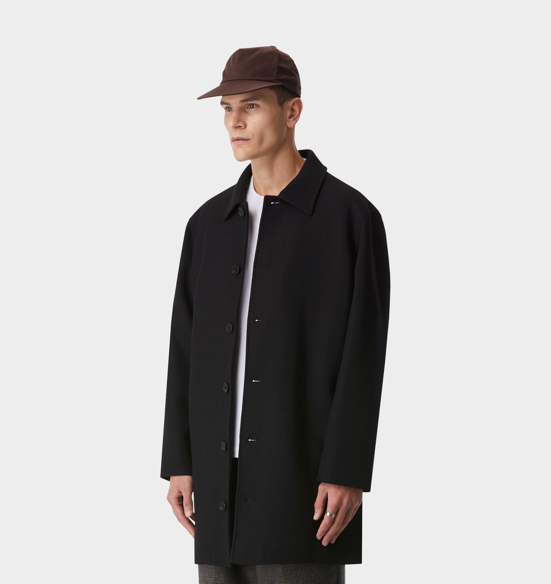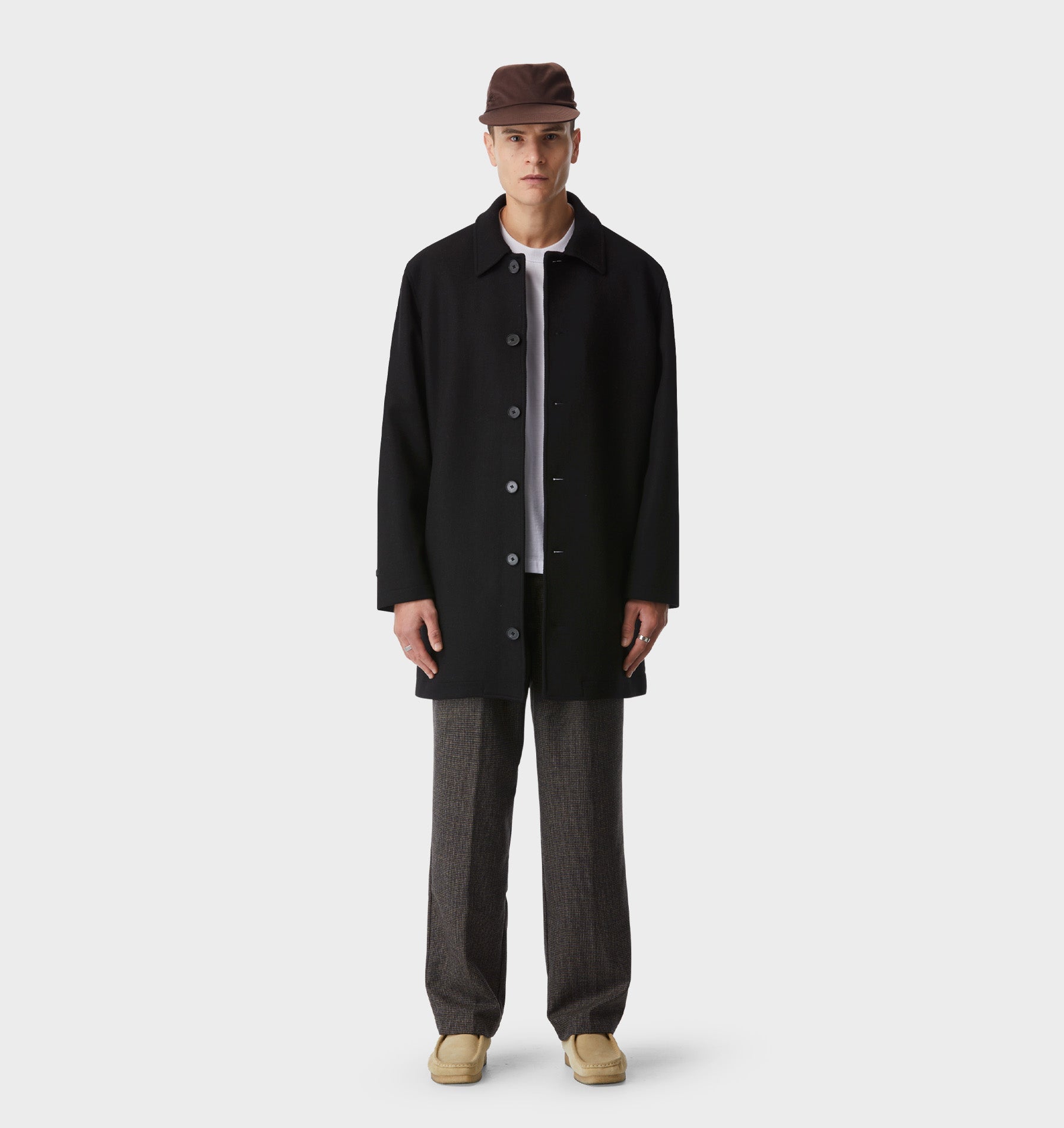 Finished with a leather label on the left sleeve hem, the Carson Wool Coat is understated, versatile, and built to become your cold-weather staple.