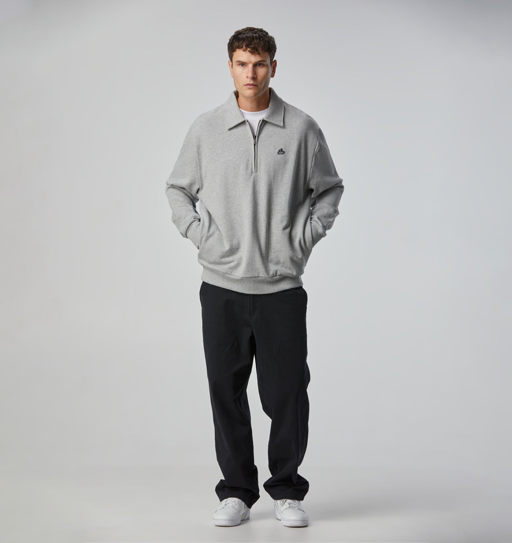 A premium collared sweater with a custom centre zip, featuring side seam pockets with key topstitch detailing. The Mario Pullover now features a custom ILU patch on the left chest. These subtle elements create the perfect understated piece, ideal for the well-kept man.