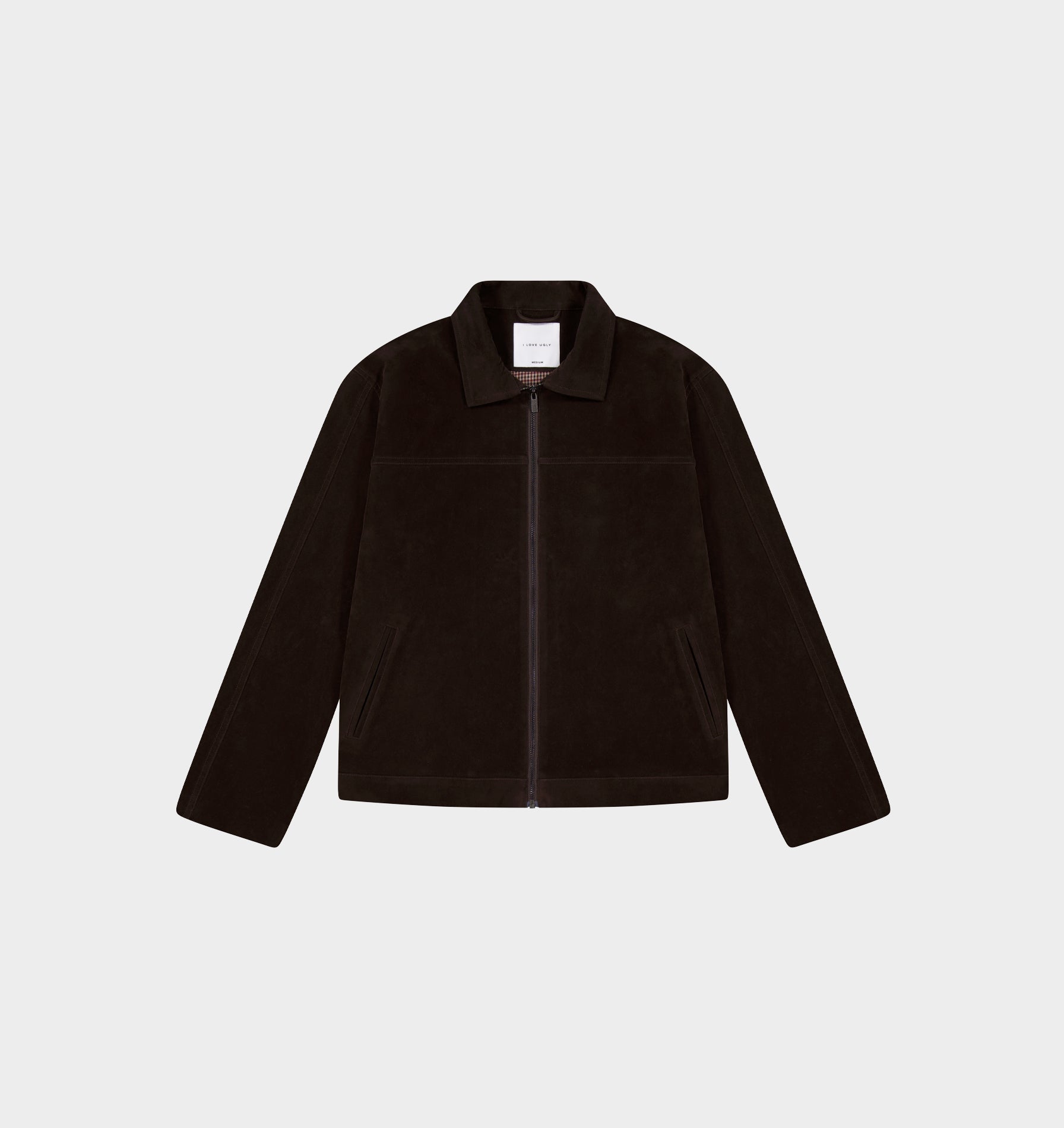 Crafted with faux suede and custom gunmetal hardware, it features a center front zip and front double welt pockets and a contrast check lining.