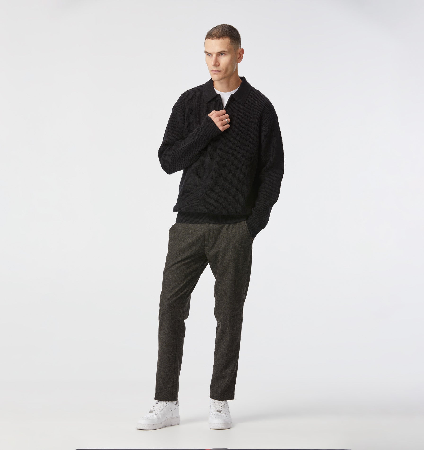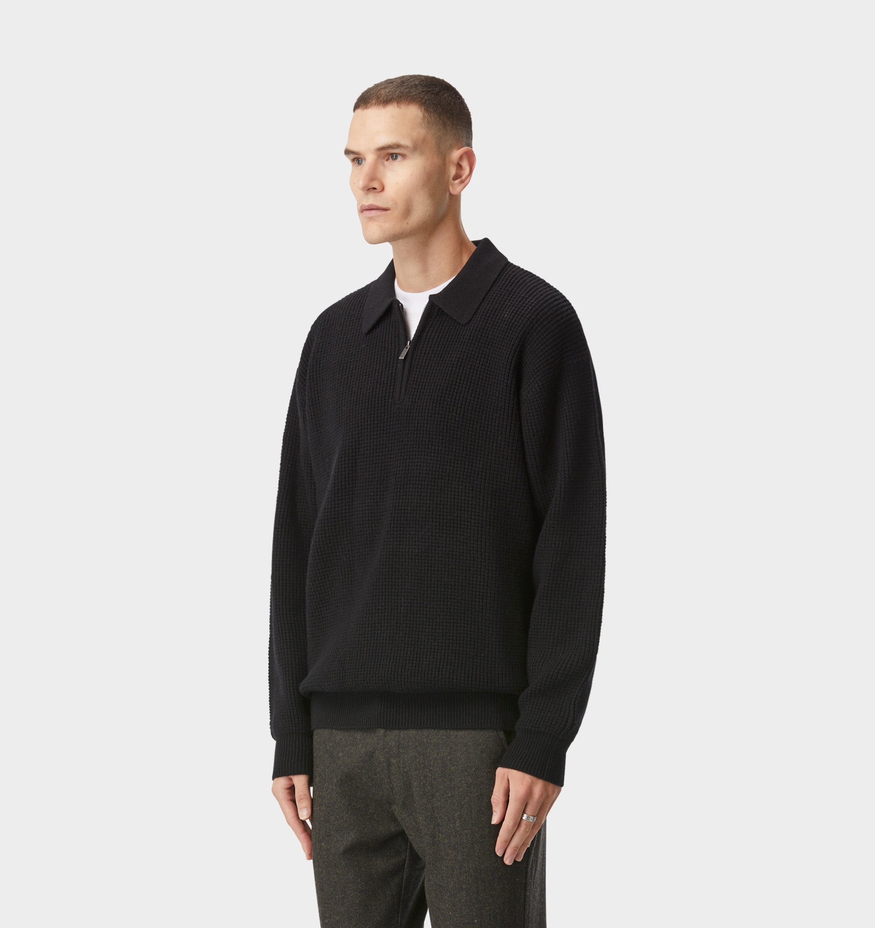 A premium collared knit sweater with a custom centre front zip, and a waffle knit construction. The Mario knit sweater is a premium product, featuring a merino blend to keep you warm through the cooler months without compromising on style. These subtle elements create the perfect understated piece, ideal for the well-kept man.